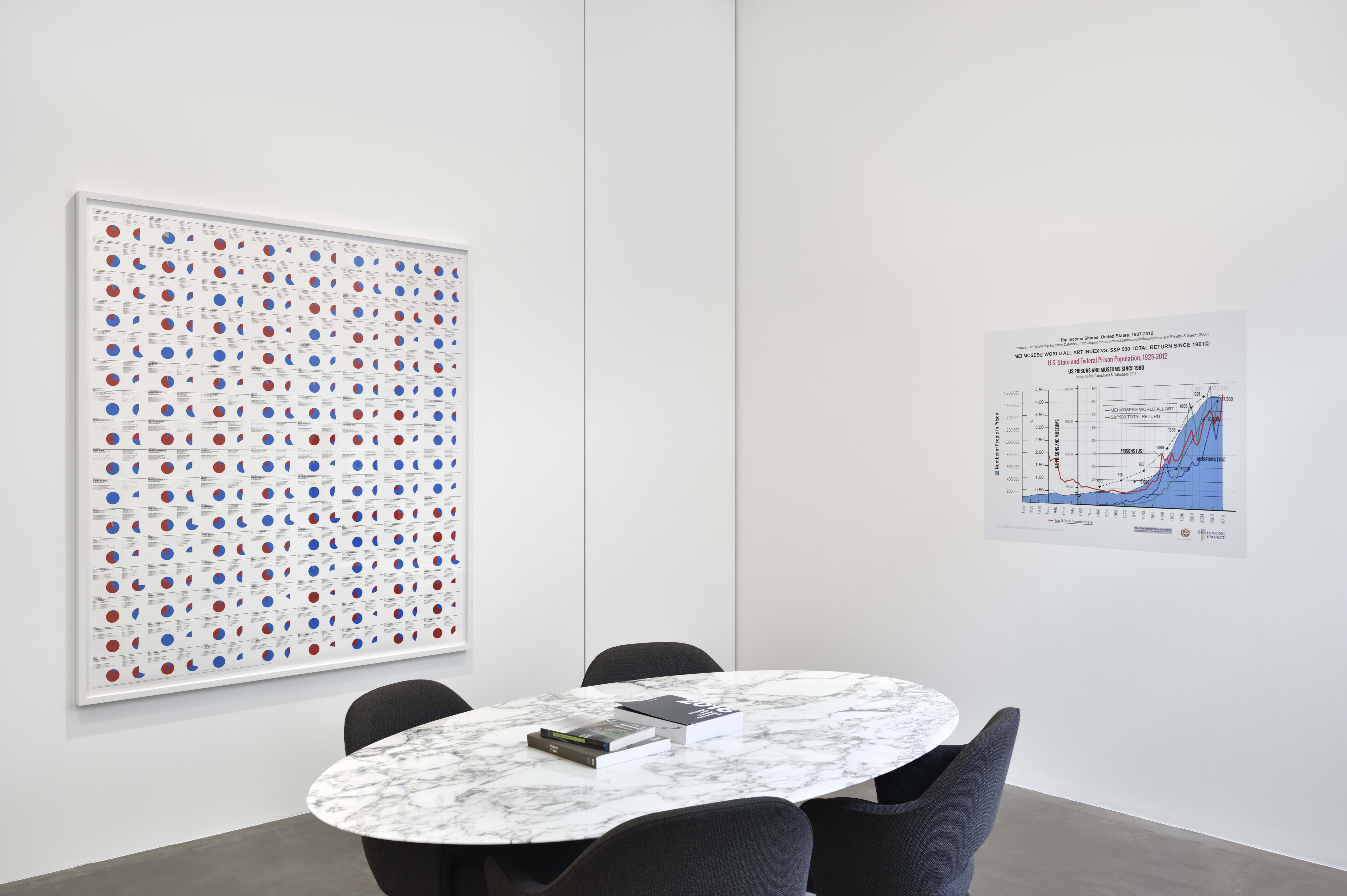 In the ground floor, lower gallery, and vaulted room, Fraser revisits her most notorious projects, Untitled, 2003, and proposes a sequel in the form of a new sculptural installation which, twenty years on, extends her exploration of the intersections of financial and affective economies in the contemporary art world. In the Showroom, a selection of books, texts, and graphic works represent Fraser’s on-going analysis of the political and economic structures of the art field.