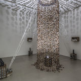 Reconfigured wood from salvaged school desks, shoelaces, light bulb, glass bottles with cork tops, sand, paper, ribbon, porcelain dogs