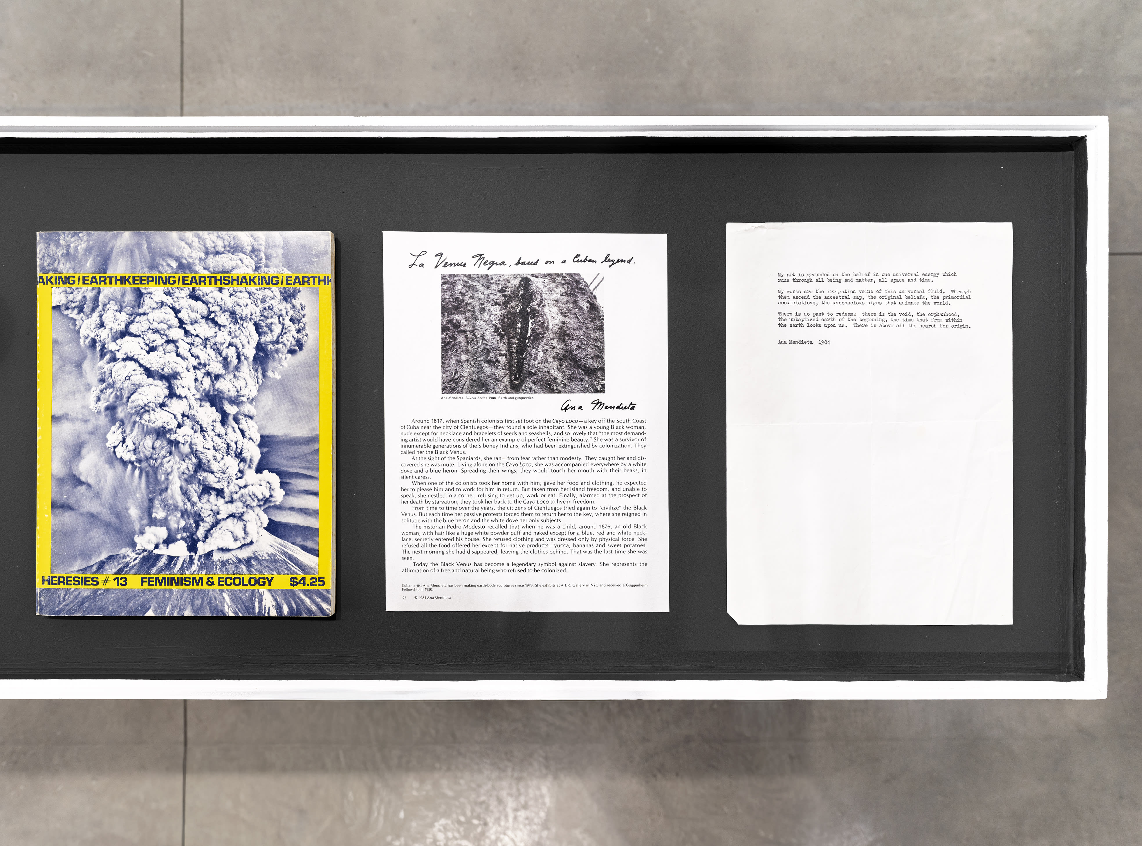Mendieta’s work has been exhibited in important solo exhibitions and museum retrospectives; exhibitions include those at MUSAC, León, Spain (2024); SESC Pompéia, São Paulo, Brazil (2023); Baltimore Museum Of Art, Baltimore, Maryland (2020); Institute of Modern Art, Brisbane, Australia (2019); Middleheim Museum, Antwerp, Belgium (2019); Institute for Contemporary Art, Galerie nationale du Jeu de Paume, Paris, France (2018); Martin-Gropius-Bau, Berlin, Germany (2018); Berkeley Art Museum and Pacific Film Archive, Berkeley, California (2016) The Israel Museum, Jerusalem, Israel (2014); Hayward Gallery, Southbank Centre, London, United Kingdom (2013); Castello di Rivoli, Turin, Italy (2013); Art Institute of Chicago, Chicago, Illinois (2011); Whitney Museum of American Art, New York (2004); Smithsonian Institution, Washington, D.C. (2004); Museum of Contemporary Art, Los Angeles, California (1998); Helsinki City Art Museum, Helsinki, Finland (1996); Centro Galego de Arte Contemporanea, Santiago de Compostela, Spain (1996); New Museum, New York, New York (1987).