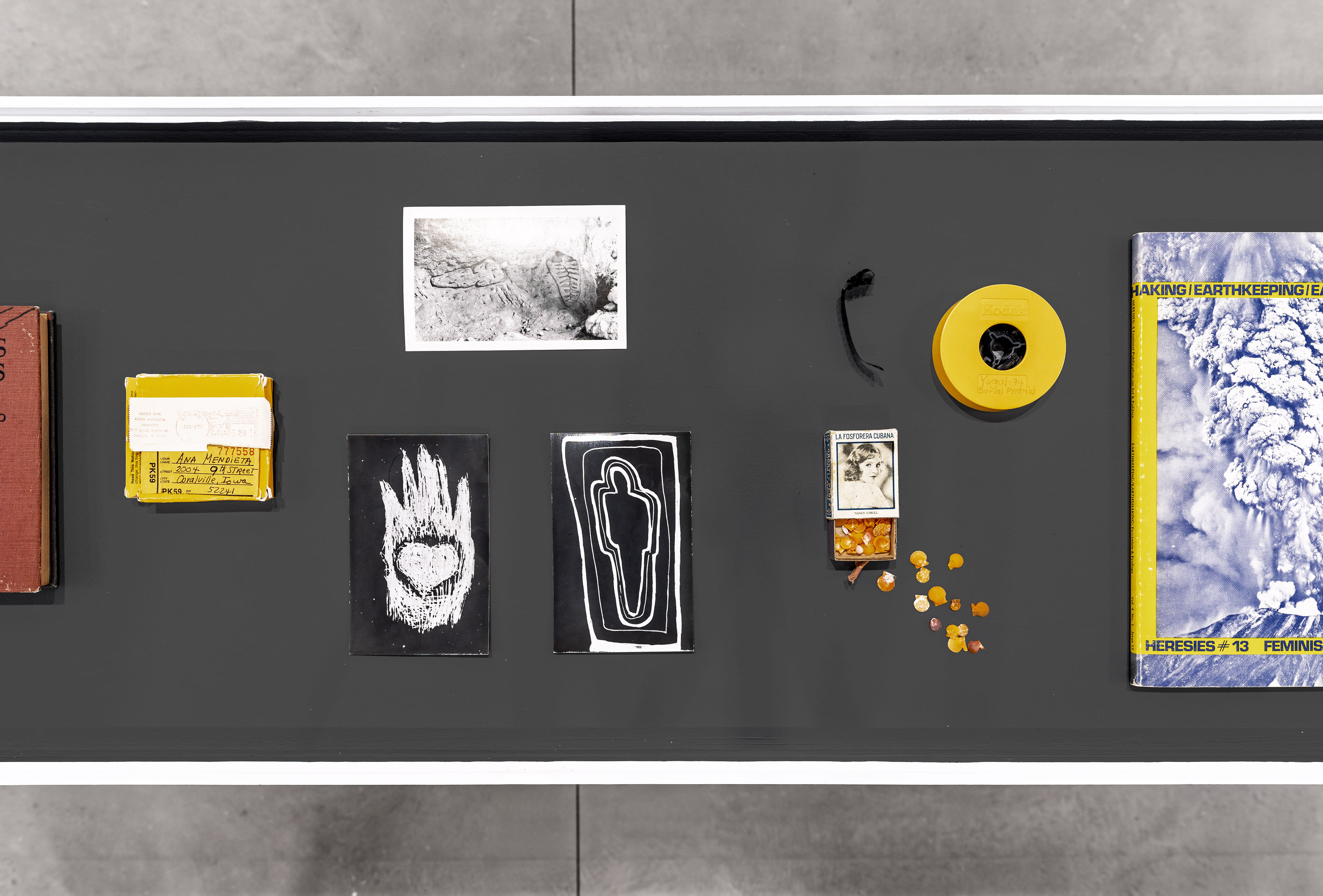 An interest in themes of transformation – birth, life, death, regeneration – is evident throughout her oeuvre, and can be seen in Ñañigo Burial, 1976, installed in the first floor gallery. Comprised of black candles which originally outlined the contours of the artist’s body, its title points to the influence of the Abakuá society of Cuba, also known as Ñañiguismo, which offers spiritual protection to its members. Drawn to this and Afro Cuban Santeria traditions, which blend the Yoruba religion of West Africa, Roman Catholicism, and Spiritism, Mendieta sought magic and the divine to regenerate life within her work and through nature.