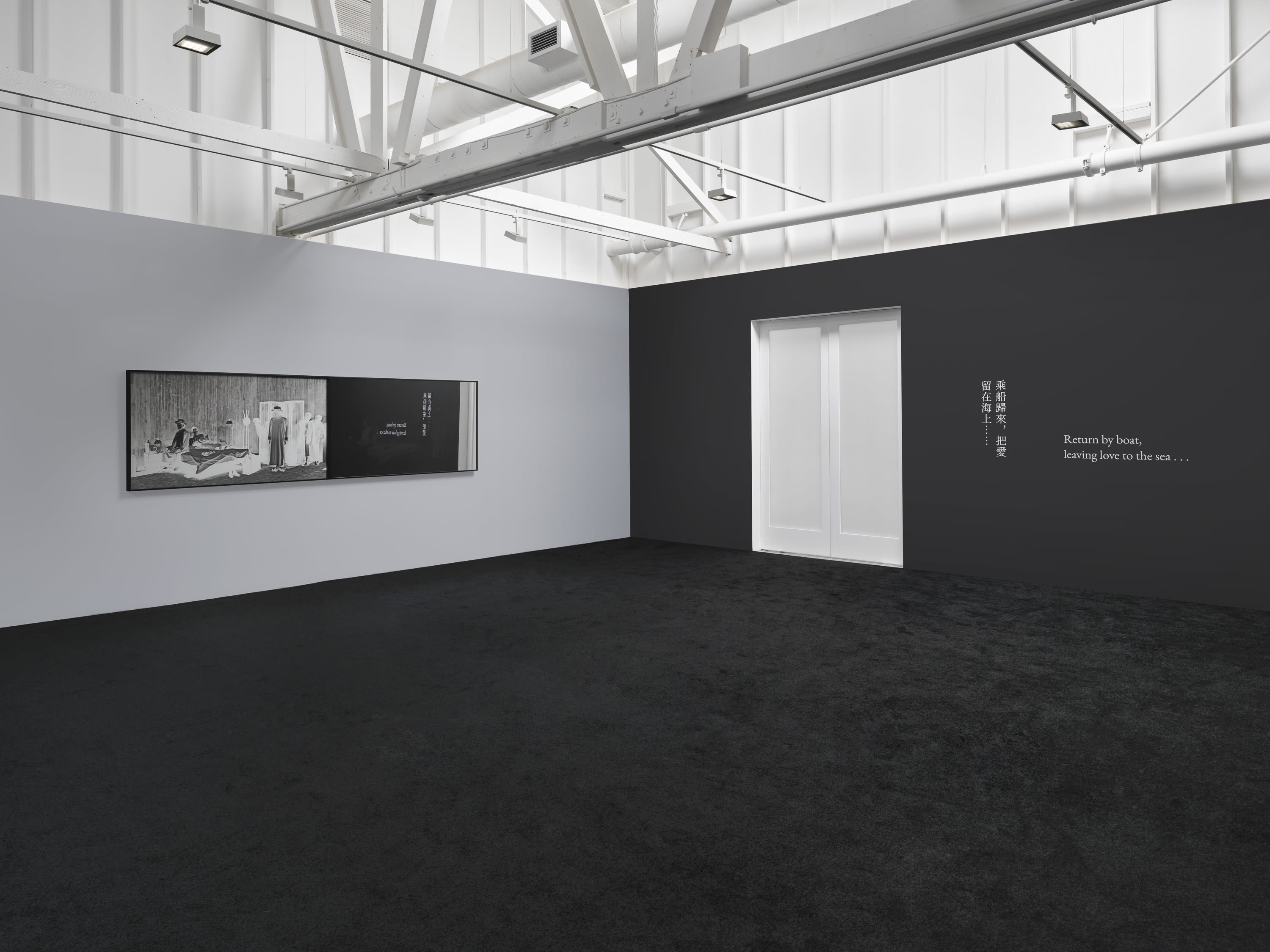 Also on view in the Main Gallery, Sparrow (2025), a new series of mixed media, is shown along walls adjacent to the film. Encompassing painting, photography, and drawing, these triptychs, each bearing the name of a month, unveil the passage of time through scenes of nature and historical narrative. “It is as if a sparrow flies over the sea, time leaves traces, year after year, day after day. Everything waits for unexpected encounters. Perhaps time is a continuous, unfinished history and a collection of everyday memories,” says Yang of the works. Nearby, the Island series (2025) includes diptychs based on stills from the film, represented here as both positive and negative photographs. Similar to inverted scenes in Sparrow on the Sea, this change encourages us to see previously hidden or obscured forms, creating a deeper picture of what was always there.